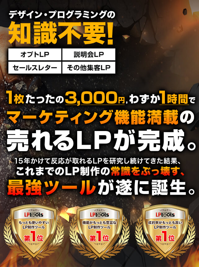 セールスレターとは、あなたの最終的な商品・サービスを販売するためのページのことを言います。特に高額な商品・サービスになってくると、伝えなければならない情報はかなり多いです。LPtoolsユーザーの方には、このセールスレターで絶対に伝えたほうが良い情報を抜け漏れなく盛り込んでもらうために、ライティング・デザイン済のセールスレターテンプレートをご提供させていただきます。このテンプレートをお手本に、必要な情報がすべて盛り込まれた完璧なセールスレターを完成させてください。